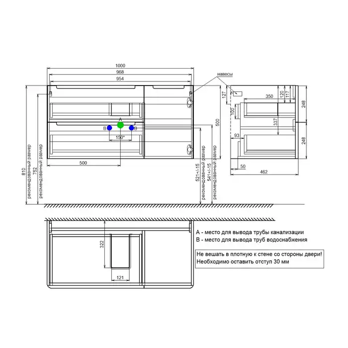 Интегрированные ручки, плоский умывальник, ящики с механизмом плавного доведения