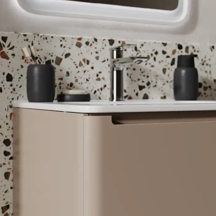 Интегрированные ручки, плоский умывальник, ящики с механизмом плавного доведения