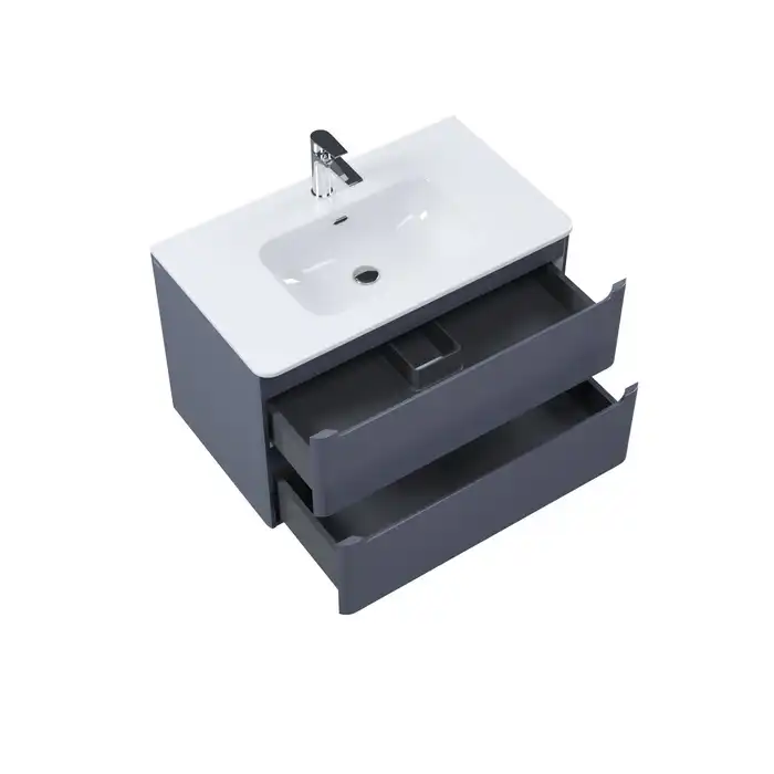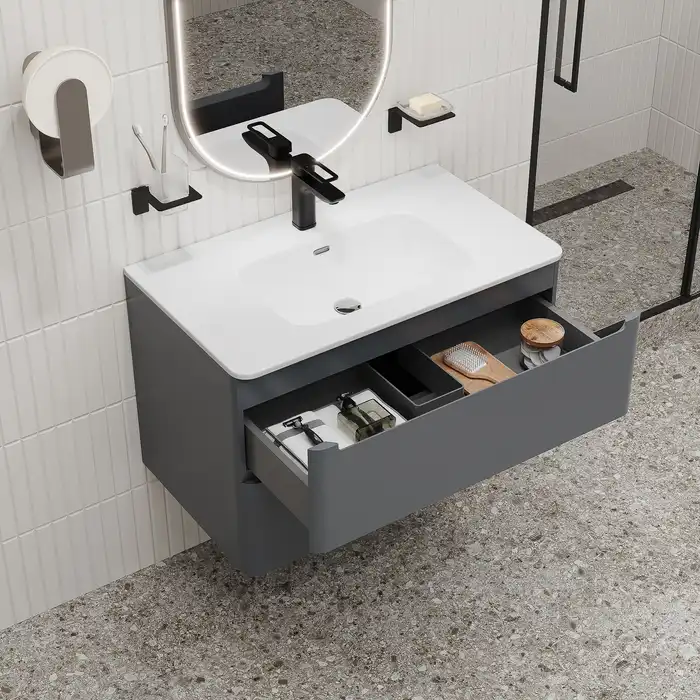 Интегрированные ручки, плоский умывальник, ящики с механизмом плавного доведения