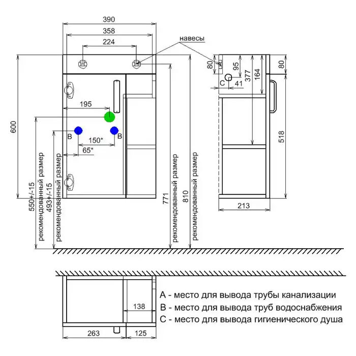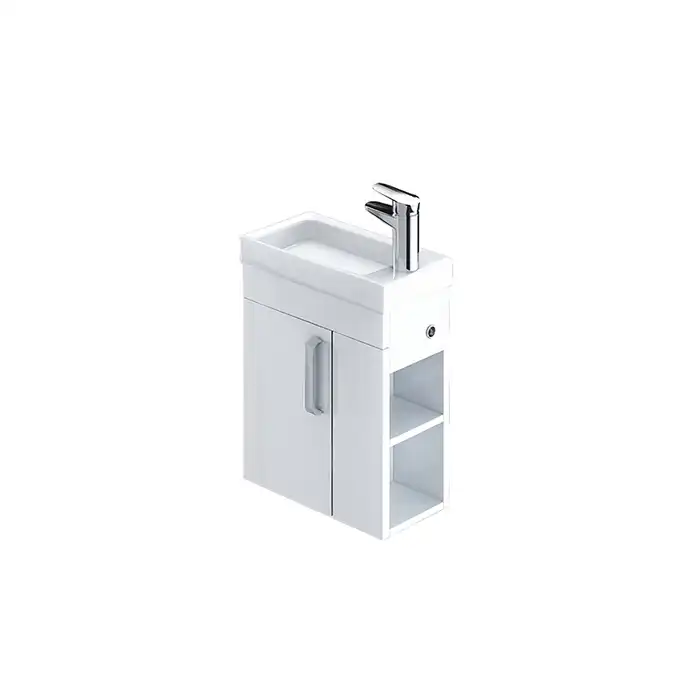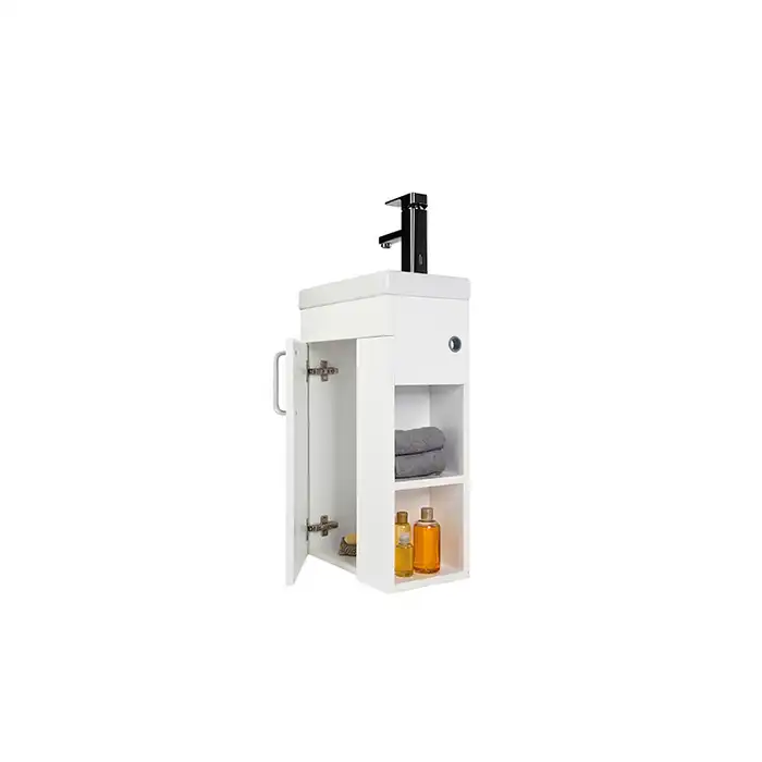 Тумба с умывальником для ванной комнаты, подвесная. Размеры тумбы без умывальника: 213х390х600 мм (ДхШхВ). Размеры умывальника: 220х400 мм (ДхШ). Фасад ЛДСП 16 мм в эмали, боковины ЛДСП белый глянец. Одна распашная дверца, фальш-фасад, 2 открытые полки с правой стороны. Сбоку тумбы - отверстие для гигиенического душа с пластиковым кольцом. Петли с доводчиком. Упаковка: картон, пленка, пенопластовые уголки.