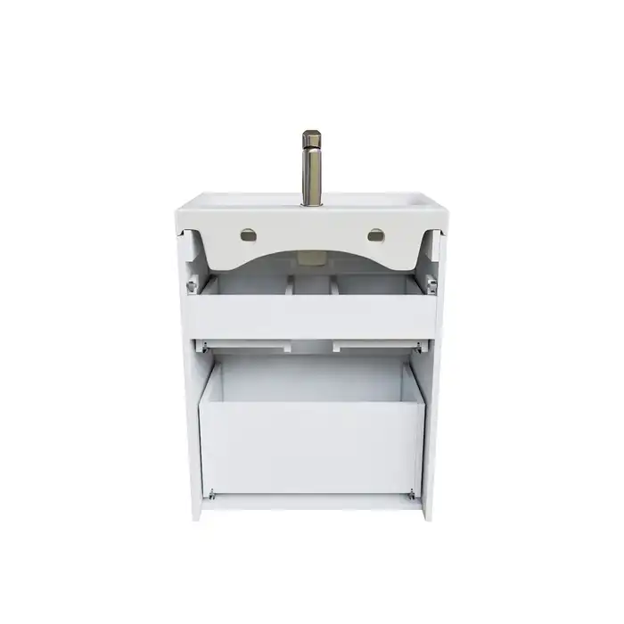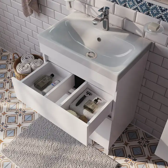 Напольная тумба для ванной комнаты Zodiac с умывальником и ящиками – высокий уровень удобства и практичности в сочетании с лаконичным универсальным дизайном. • Фасад и боковины изготовлены из ЛДСП, покрыты несколькими слоями белоснежной эмали. Такое качественное исполнение обеспечит долгий срок службы мебели во влажном помещении ванной (при соблюдении рекомендаций по уходу). • Керамический умывальник с высоким бортом и большой вместительной чашей в комплекте. Удобен для гигиенических и хозяйственных нужд. • Два вместительных выдвижных ящика с механизмом плавного доведения закрываются плавно и бесшумно. Интегрированные ручки. Фурнитура рассчитана на 30 000 открываний, что составляет более 10 лет исправной работы. • В комплекте также белые пластиковые ножки высотой 100 мм и сифон, за счет чего тумба полностью готова к установке. Гарантия на мебель IDDIS® – 3 года, на умывальник – 25 лет. (с) Авторский текст, октябрь 2022 г.