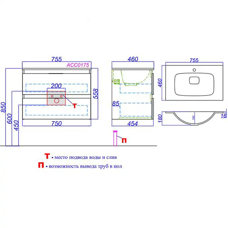 "Accent" 75 тумба c умывальником Malaga 750, цвет дуб золотой, ACC0175DZ, 750*560*460