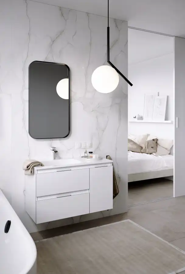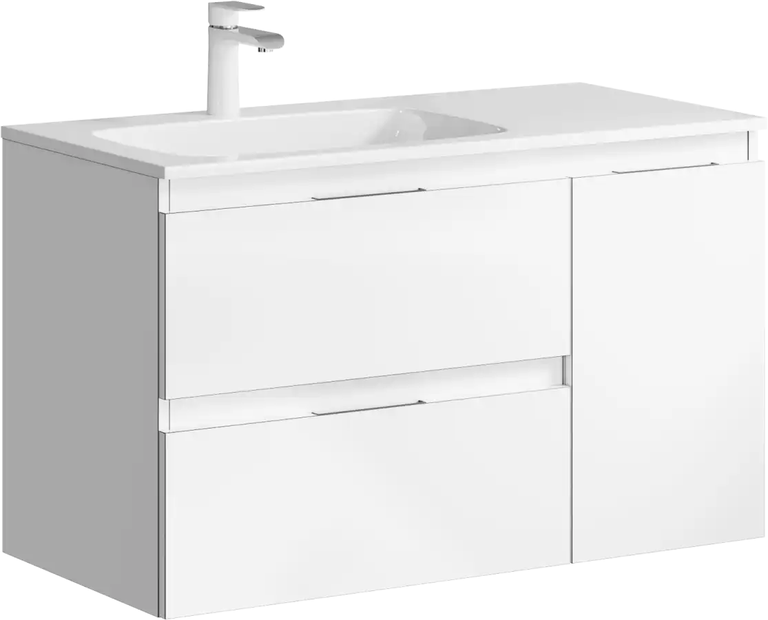 Подвесная тумба Aqwella 5 Stars Accent ACC0109LW с двумя ящиками и одной дверью в белом цвете с умывальником из литьевого мрамора (чаша слева) Malaga 900L