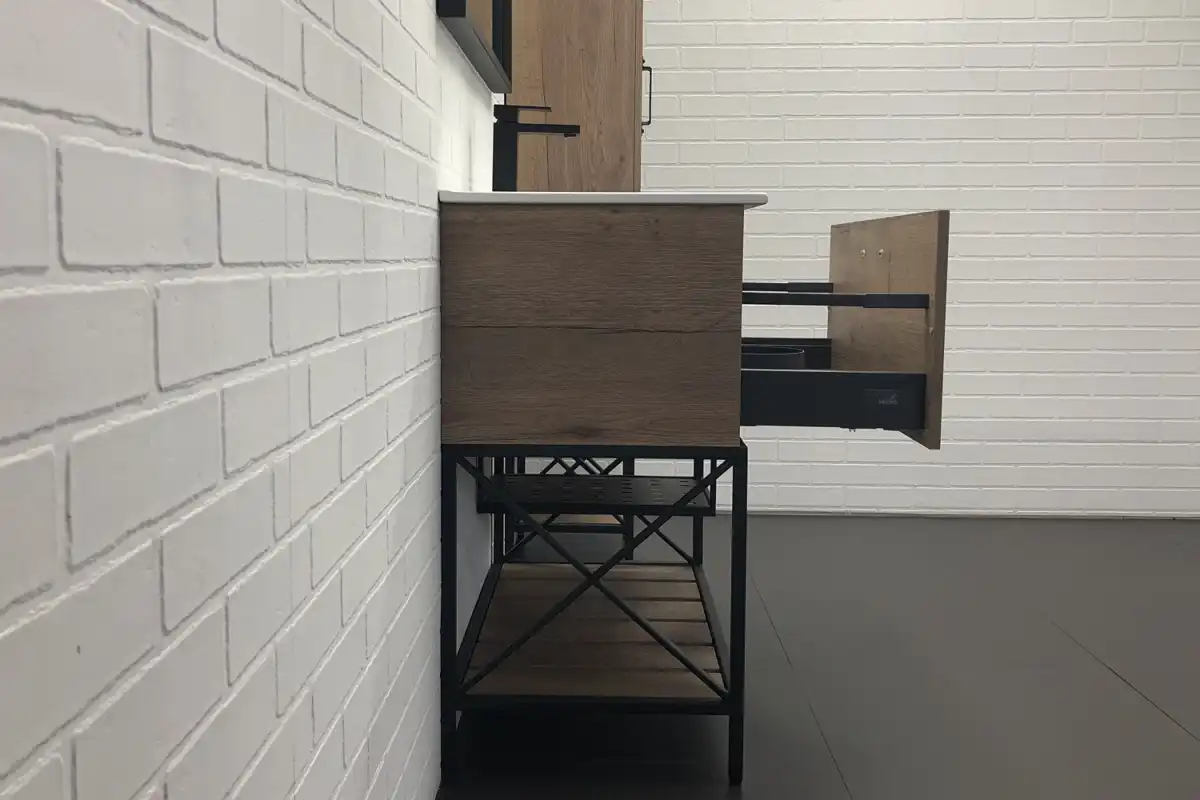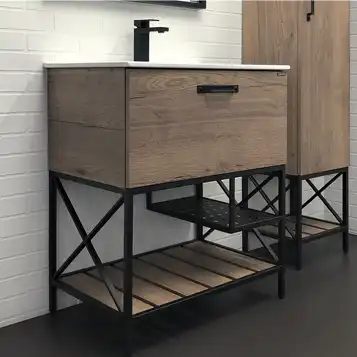 Название: Тумба-умывальник Артикул: Бредфорд 75 Варианты цвета корпуса и фасада: Дуб темный Материал корпуса: влагостойкое ЛДСП Варианты цвета каркаса: черный Материал каркаса: сталь Габариты (ШхВхГ): 755*870*465 мм Комплектация: белая раковина Comforty 75E Напольная тумба-умывальник с одним широким выкатным ящиком, оснащенным системой плавного закрывания и пространствами открытого хранения. В основании тумбы - каркас из стального профиля окрашенный черной эмалью. Тумба подготовлена для подключения коммуникаций снизу.