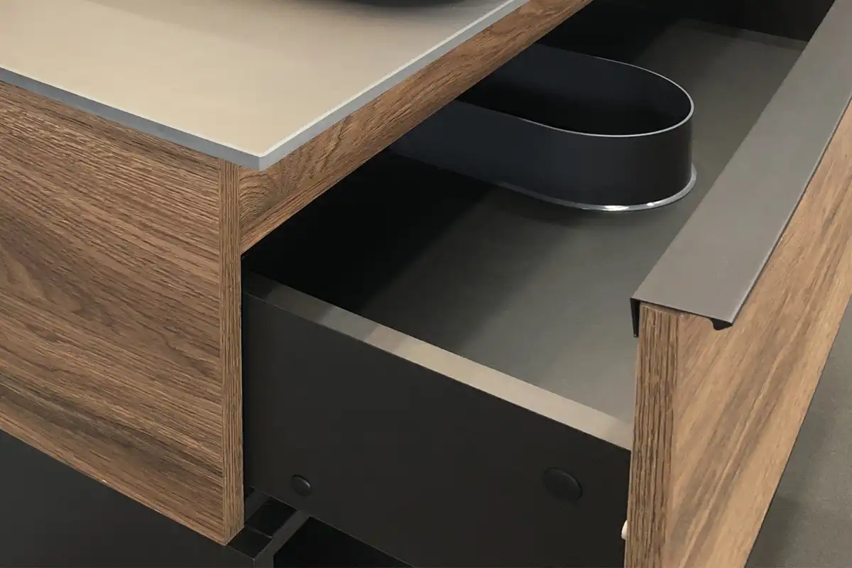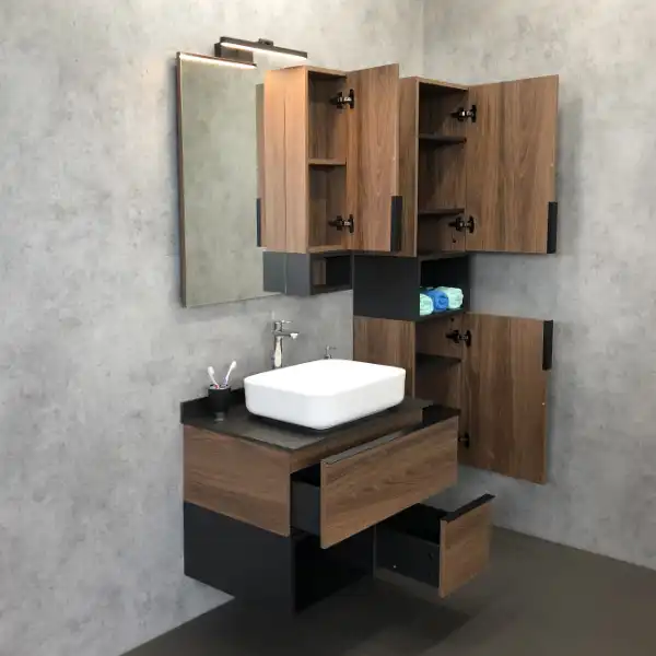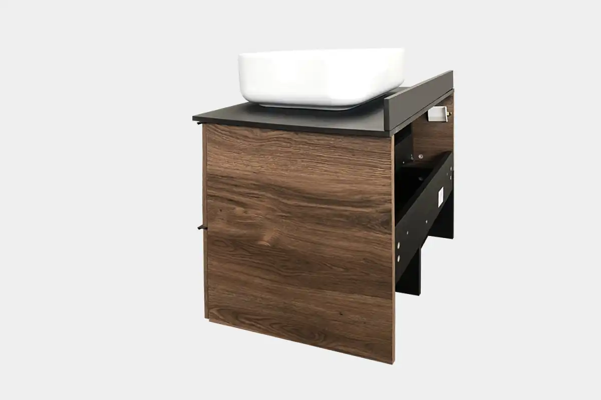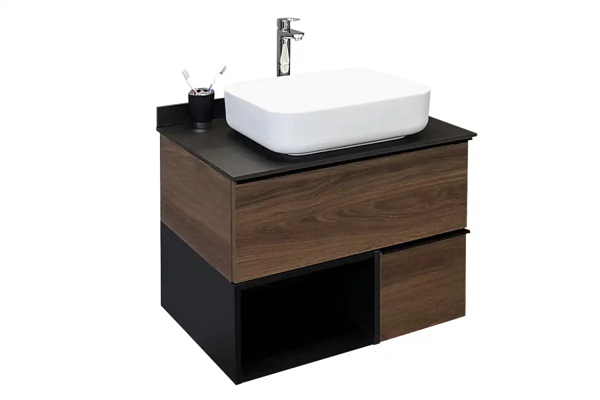 Название: Тумба-умывальник Артикул: Штутгарт 75 Варианты цвета корпуса: дуб темно-коричневый Материал корпуса: влагостойкое ЛДСП Цвет фасада: дуб темно-коричневый Материал фасада: влагостойкое ЛДСП Габариты (ШхВхГ): 755*685*520 мм Комплектация: накладная раковина Comforty T-Y9378, столешница из керамогранита Тумба-умывальник в современном стиле с двумя выкатными ящиками и пространством для открытого хранения. Ящики оснащены системой с плавным закрыванием. Тумба укомплектована черными матовыми алюминиевыми ручками и столешницей, плинтусом из керамогранита и накладной прямоугольной раковиной из санфарфора. Тумба подготовлена для подключения водоснабжения снизу.