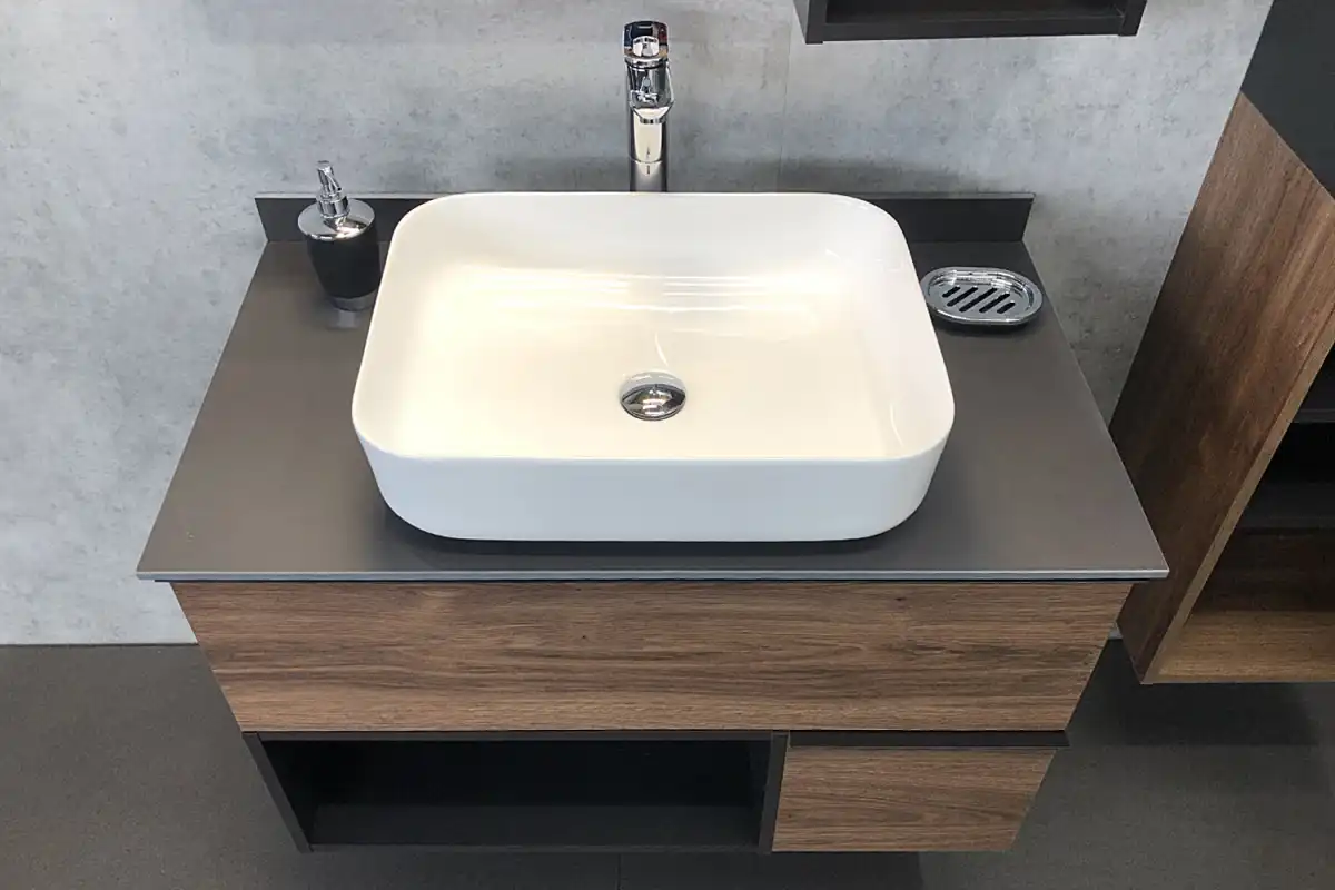 Название: Тумба-умывальник Артикул: Штутгарт 90 Варианты цвета корпуса: Дуб темно-коричневый Материал корпуса: влагостойкое ЛДСП Цвет фасада: Дуб темно-коричневый Материал фасада: влагостойкое ЛДСП Габариты (ШхВхГ): 905*685*520 мм Комплектация: керамическая раковина-чаша Comforty T-Y9378 Подвесная тумба с двумя ящиками оборудованными системой плавного закрывания и пространством для открытого хранения. На ящиках тумбы черные матовые алюминиевые ручки. Прямоугольная раковина-чаша установлена на столешницу из керамогранита. В комплекте также пристенный плинтус.