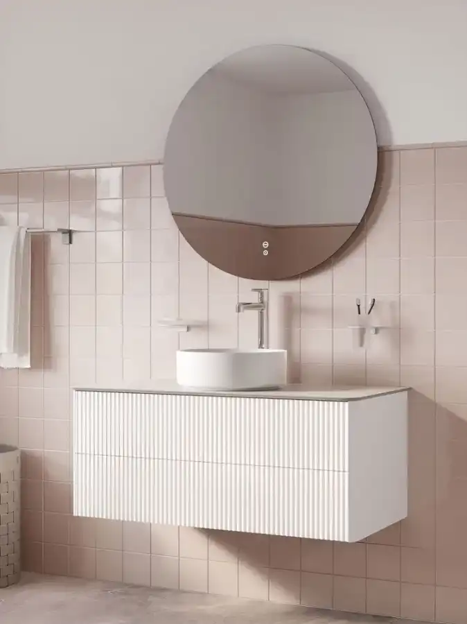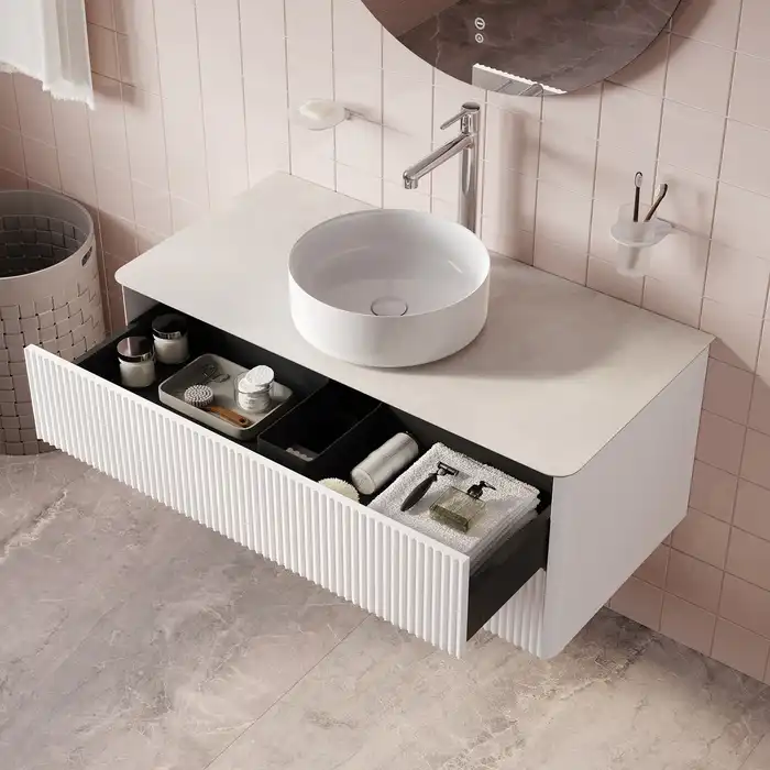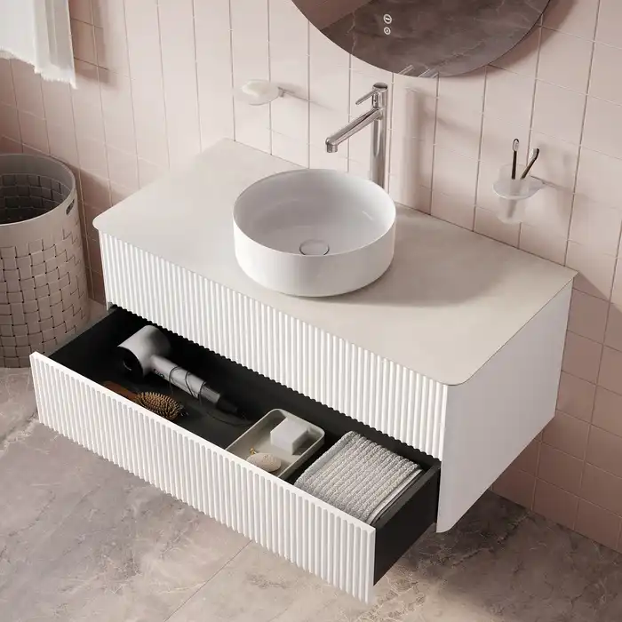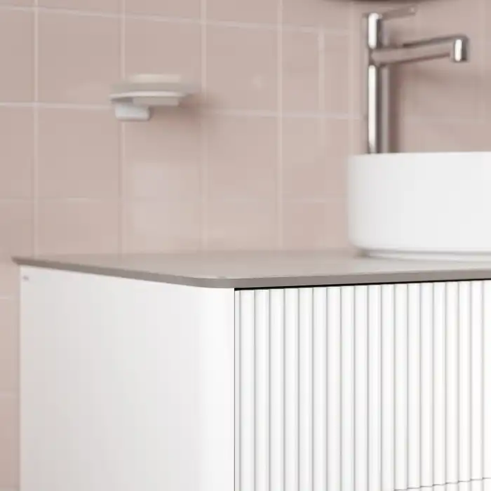Стильная подвесная тумба для ванной комнаты Aiger с выдвижными ящиками и столешницей из керамогранита – красивый лаконичный дизайн вне времени с трендовой вертикальной фрезеровкой.
