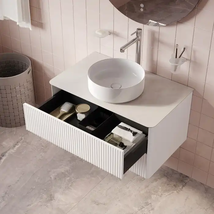 Стильная подвесная тумба для ванной комнаты Aiger с выдвижными ящиками и столешницей из керамогранита – красивый лаконичный дизайн вне времени с трендовой вертикальной фрезеровкой.