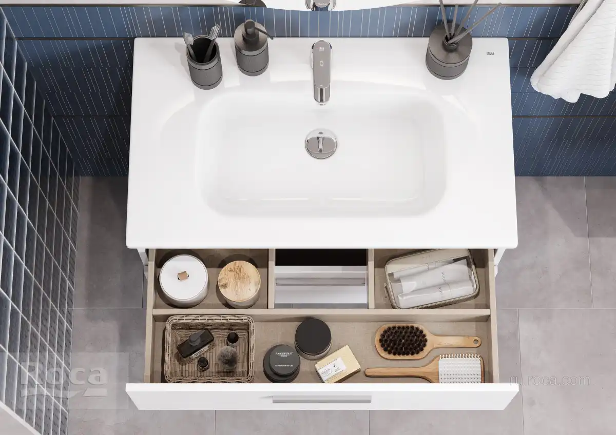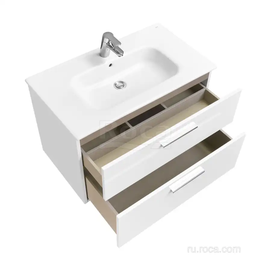 Модуль под раковину Roca Victoria 80 A857470806 в цвете белый глянец обладает универсальным современным дизайном и функциональностью. Корпус и фасады выполнены из влагостойкой ЛДСП, окрашенной полиэфирной краской ультрафиолетового отверждения. Удобная металлическая ручка и направляющие с функцией silent system делают процесс открывания ящиков легким и приятным. Внутренняя отделка ящиков выполнена в цвете бежевый текстиль, приятна на ощупь и предотвращает скольжение предметов. Пространство верхнего ящика разделено на три части, что позволяет хранить предметы для ванной комнаты в идеальном порядке. Благодаря универсальному дизайну модули под раковину VICTORIA могут сочетаться с различными вариантами зеркал и зеркальных шкафов из коллекций THE GAP ORIGINAL, ANETO, VICTORIA NORD, VICTORIA. Сифон для раковины приобретается отдельно. К данной тумбе отдельно покупается мебельная раковина, а также накладная (для установки необходима столешница).