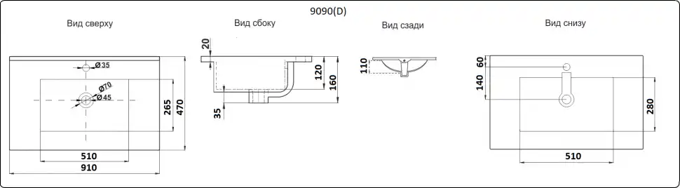 Умывальник CeramaLux 9090E 915х465х175 Полувстраиваемая цвет Белый