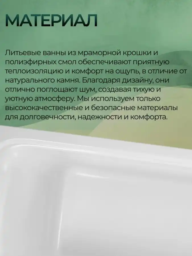 Ванны изготавливаются из измельчённого доломитового мрамора, представляющего собой смесь природного материала и смолы. Верхнее покрытие выполнено из санитарного гелькоата, ранее применявшегося только в медицине. Этот материал гарантирует идеальную отделку поверхности.
