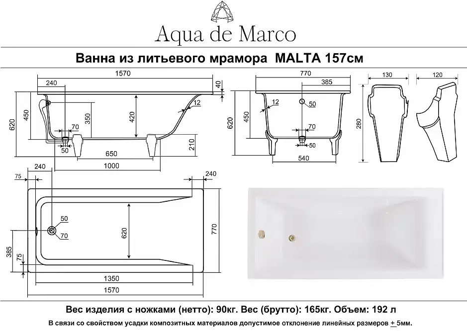 Пристенная ванна из литьевого мрамора MALTA – функциональное и лаконичное решение для современных ванных комнат. Оптимальные стандартные размеры 1,57м и 1,67м разработаны под унифицированные планировки. Также есть возможность выбрать вариант ножек: либо декоративные каменные белого цвета, либо регулируемые металлические, которые можно скрыть за фронтальными панелями соответствующего размера. Ножки включены в комплект.