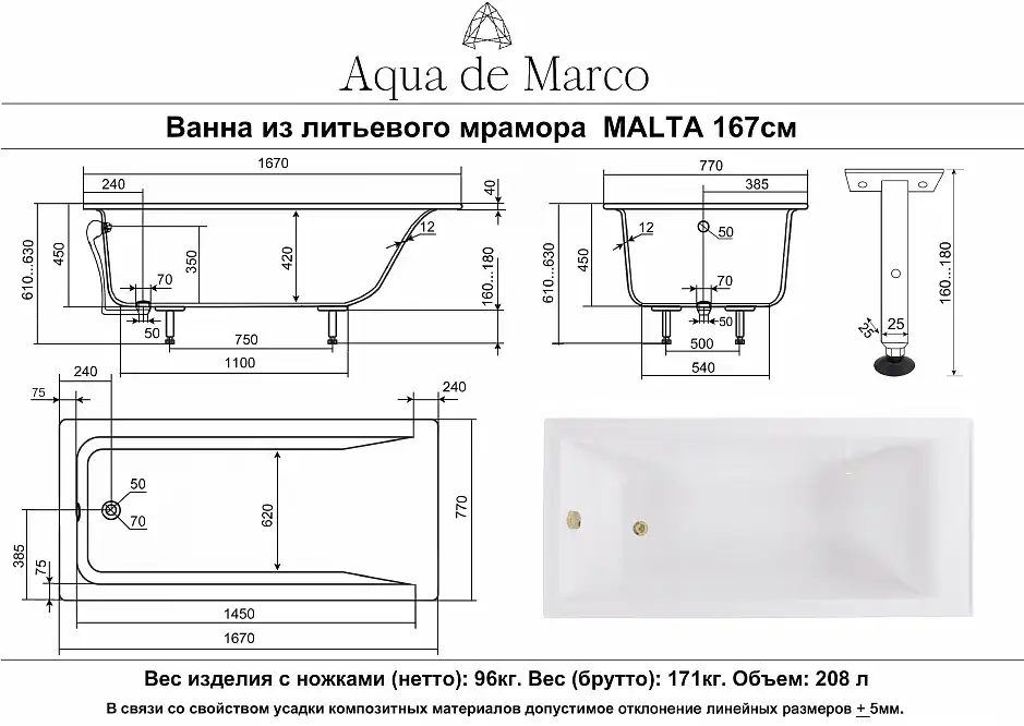 Пристенная ванна из литьевого мрамора MALTA – функциональное и лаконичное решение для современных ванных комнат. Оптимальные стандартные размеры 1,57м и 1,67м разработаны под унифицированные планировки. Также есть возможность выбрать вариант ножек: либо декоративные каменные белого цвета, либо регулируемые металлические, которые можно скрыть за фронтальными панелями соответствующего размера. Ножки включены в комплект.
