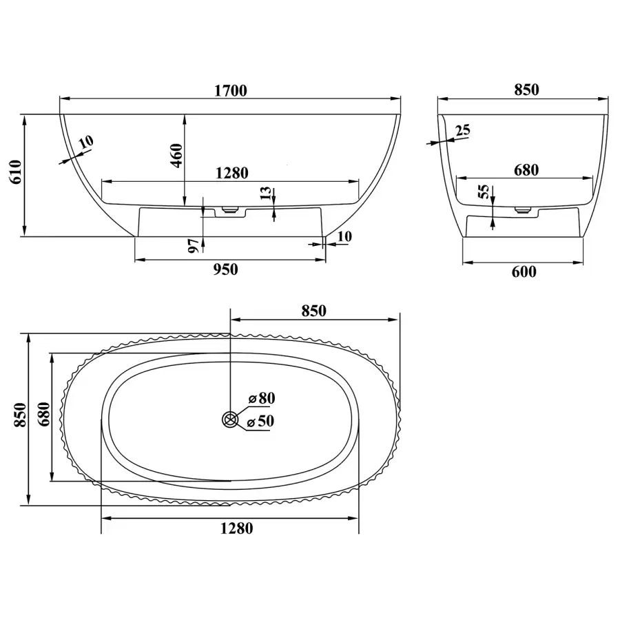 Центрально расположенный слив обеспечивает удобство использования и превосходный эстетический вид. Размеры 170 х 85 х 61 см делают ее идеальным выбором для создания уединенного пространства для отдыха как для одного человека, так и для двоих.