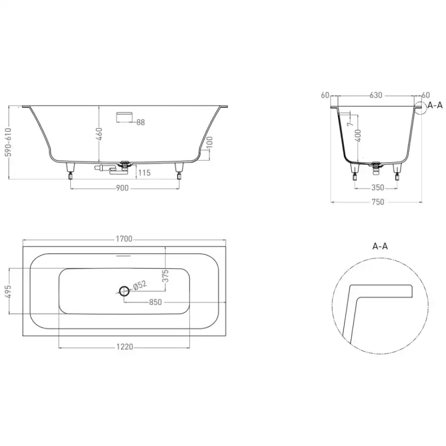Ванна Salini ORLANDA AXIS KIT 170х75 103313M из материала S-Sense, Белая матовая