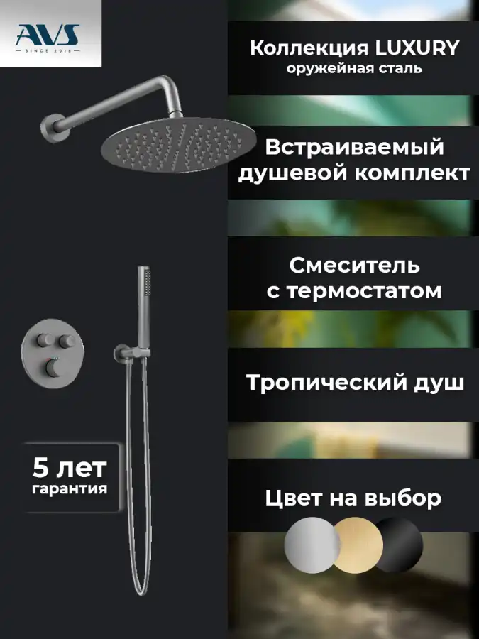 Встраиваемая душевая система AVS LUXURY 811-501-GM термостат, оружейная сталь.