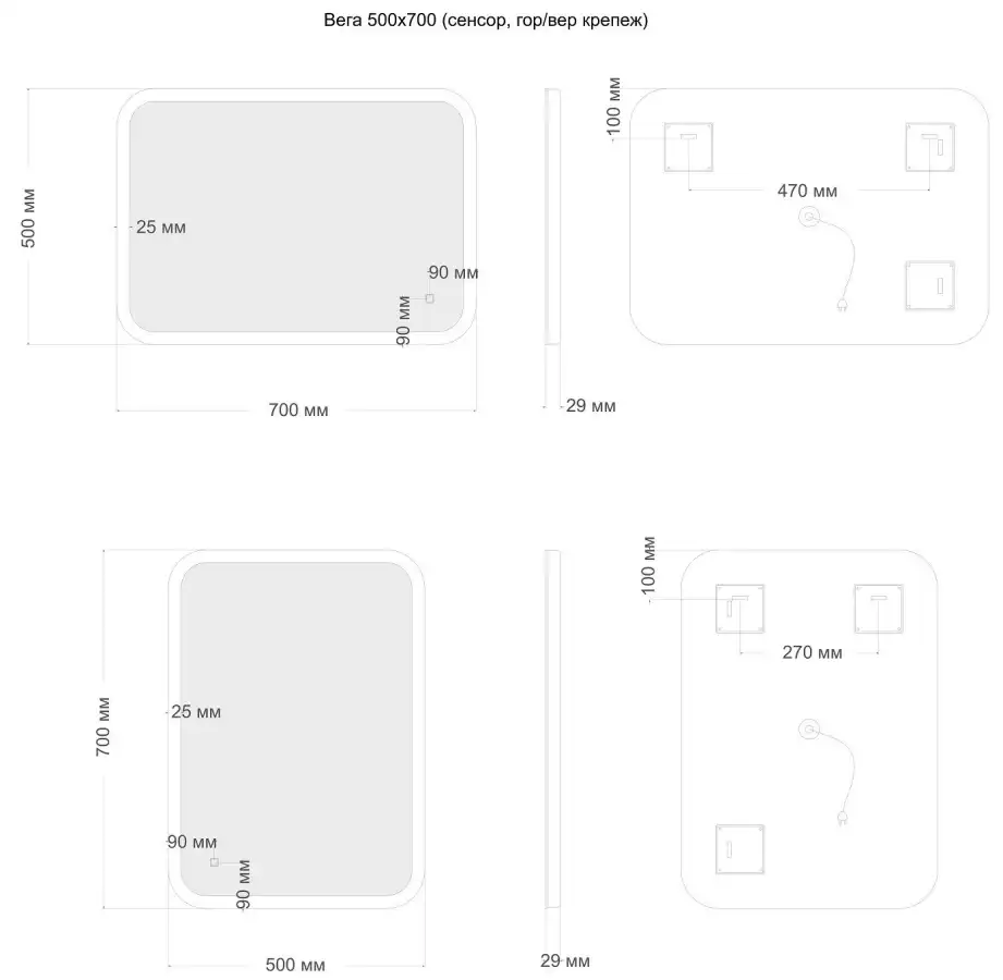 Это зеркало имеет возможность крепления на стену как в горизонтальном, так и вертикальном положении, что обеспечивает гибкость в установке в соответствии с дизайном ванной комнаты. Корпус зеркала изготовлен из практичного и прочного пластика, что облегчает его конструкцию и делает легким уход за ним. Функция подогрева отсутствует.