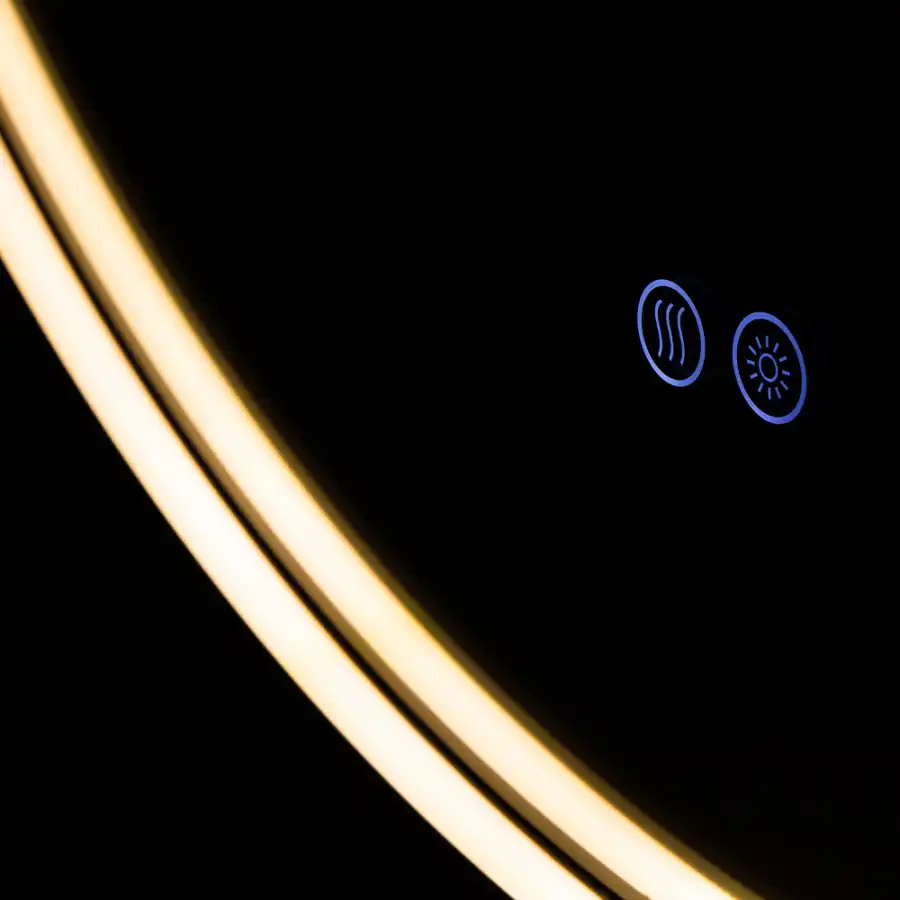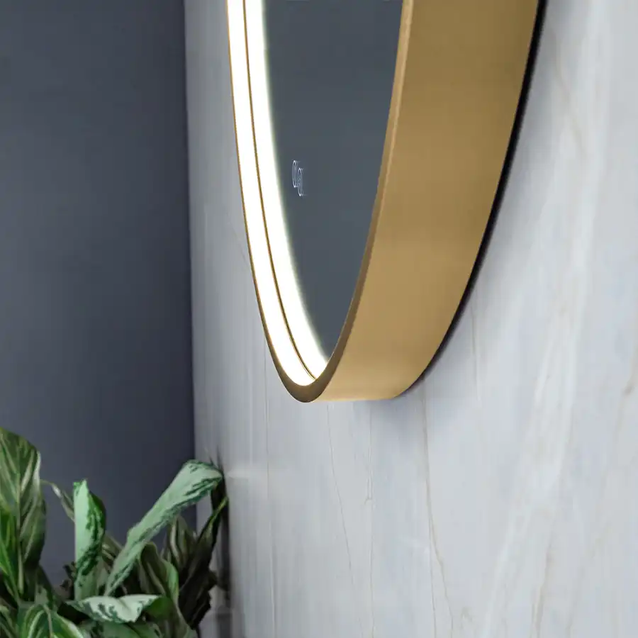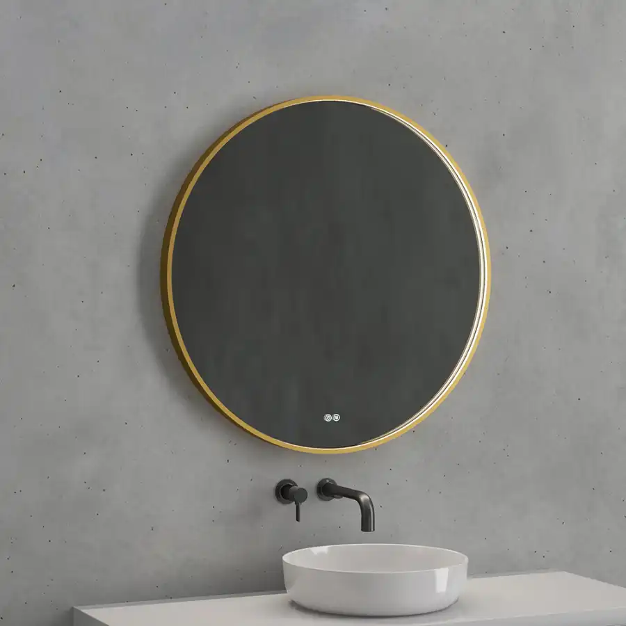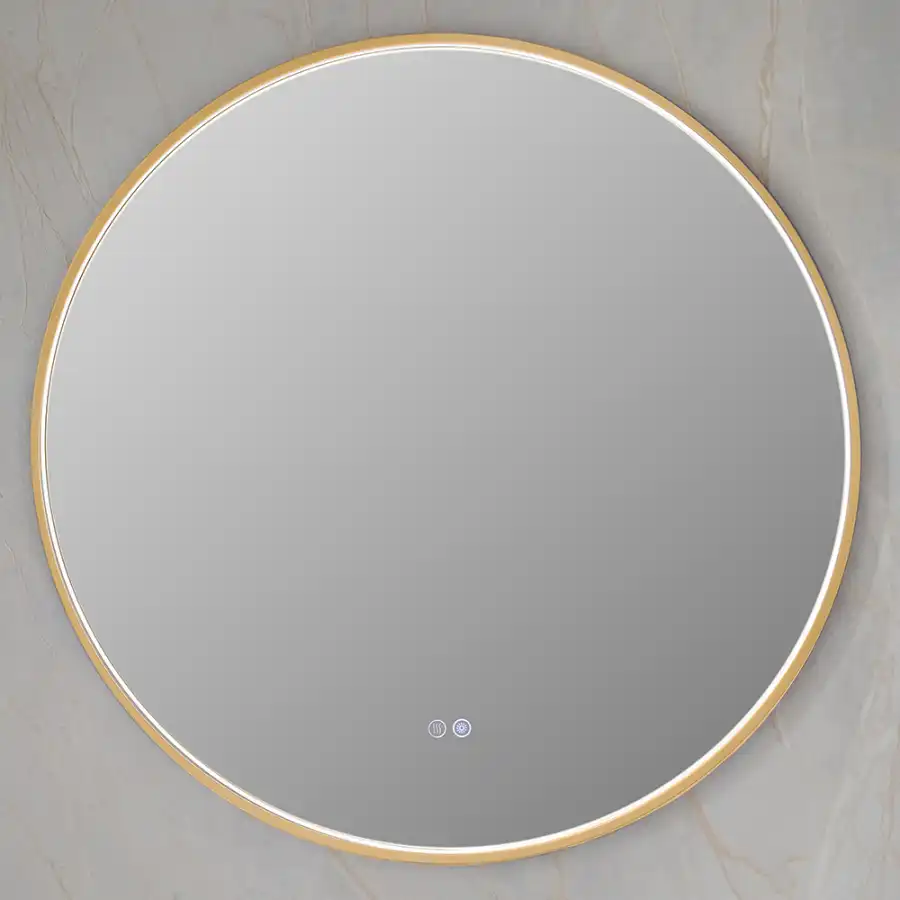 Зеркало с подсветкой AVS AZ 80 см Антипар Брашированное золото. Зеркало из серебра без меди толщиной 5 мм с защитной пленкой сзади. Три цветовые температуры. Водонепроницаемость IP44. Мощность нагрева: 28 Вт. Мощность подсветки: 15.5 Вт.