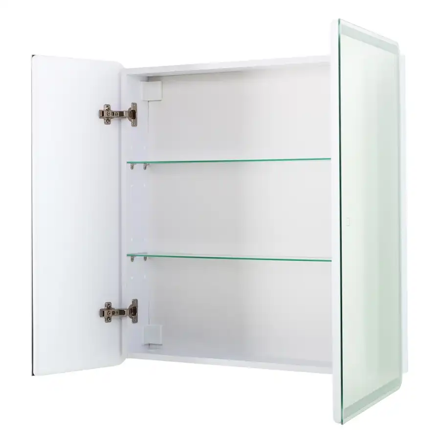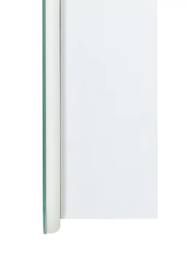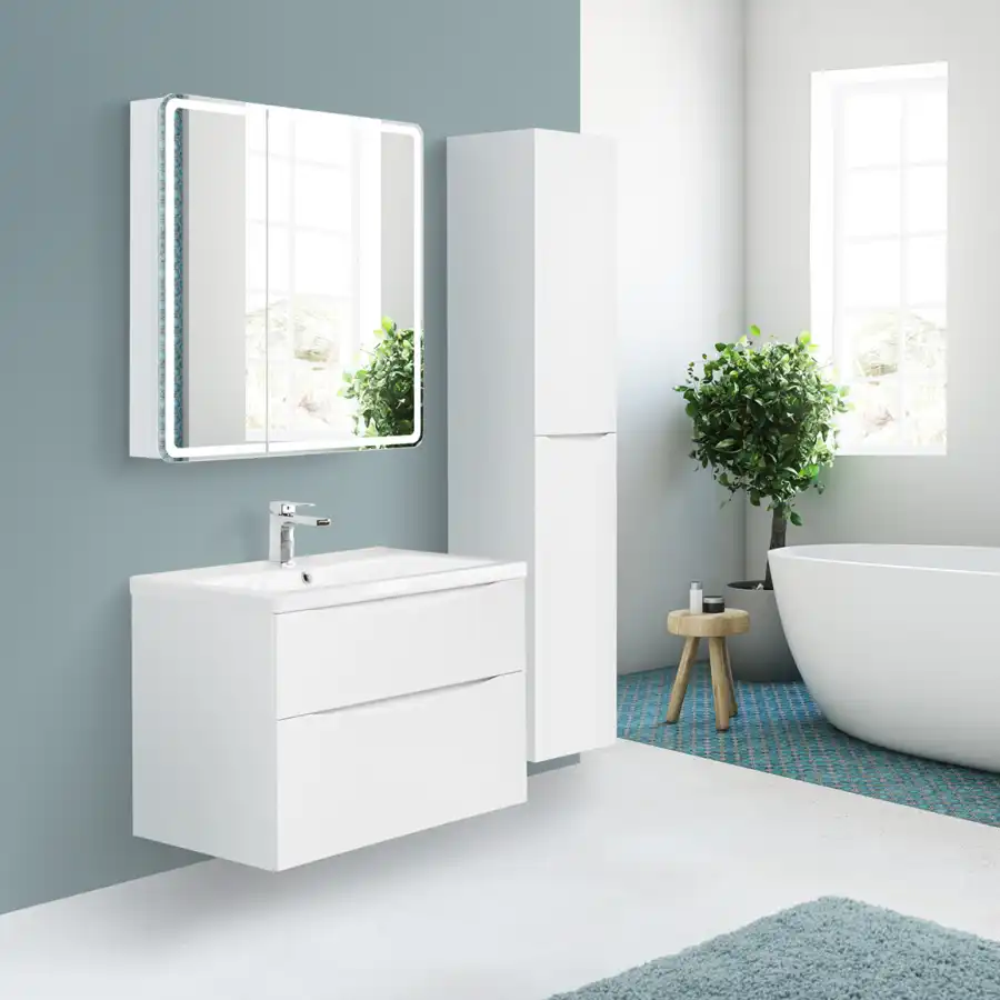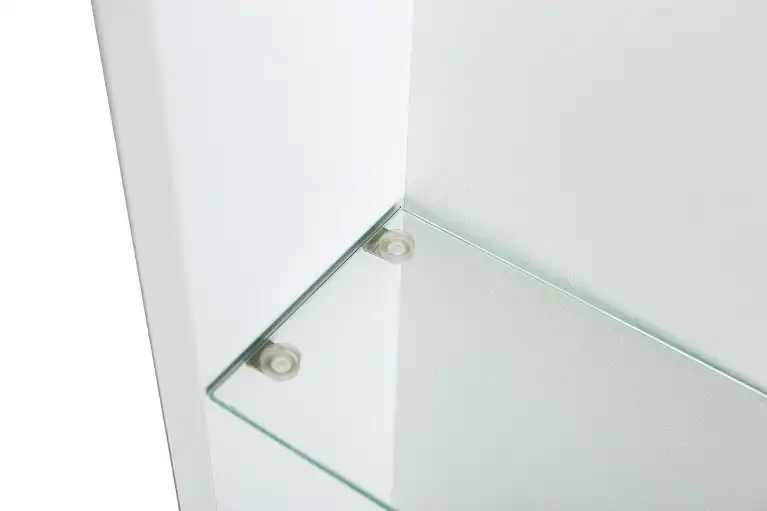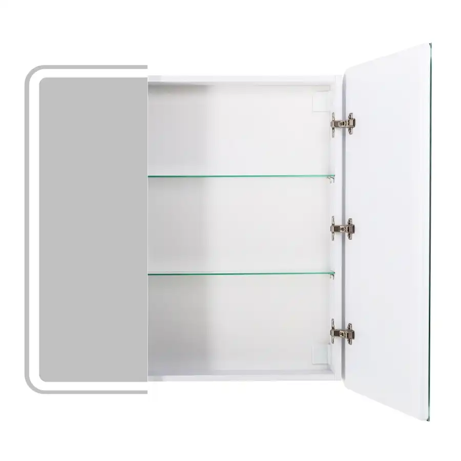 Шкаф для ванной комнаты изготовленный из влагостойкого ЛДСП со стеклянными полками внутри, с фасадом из УПС пластика и зеркала с внутренней LED подсветкой.