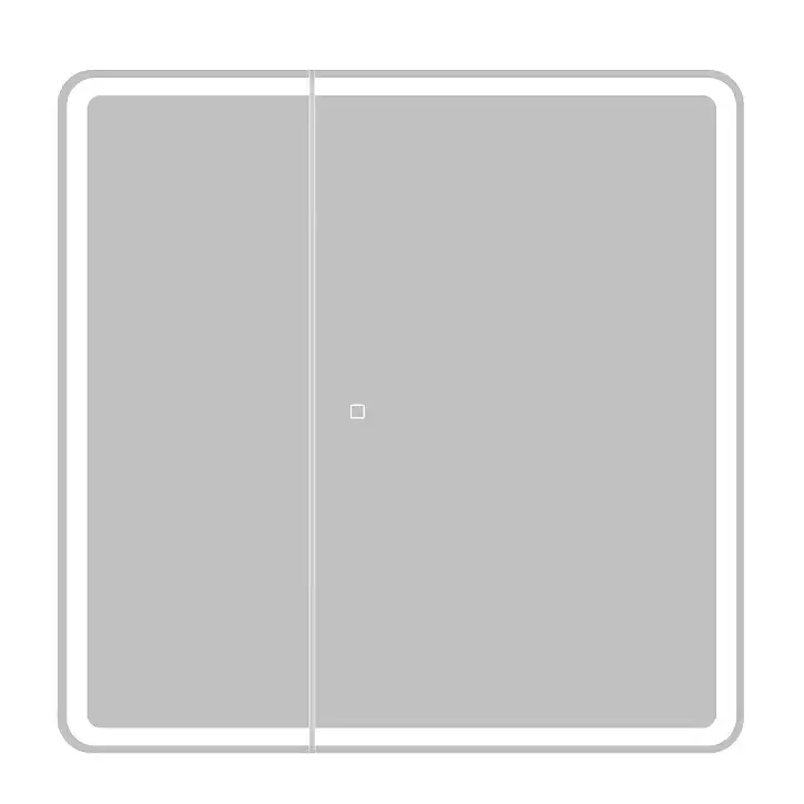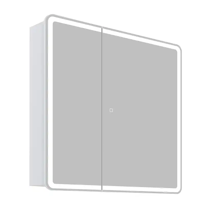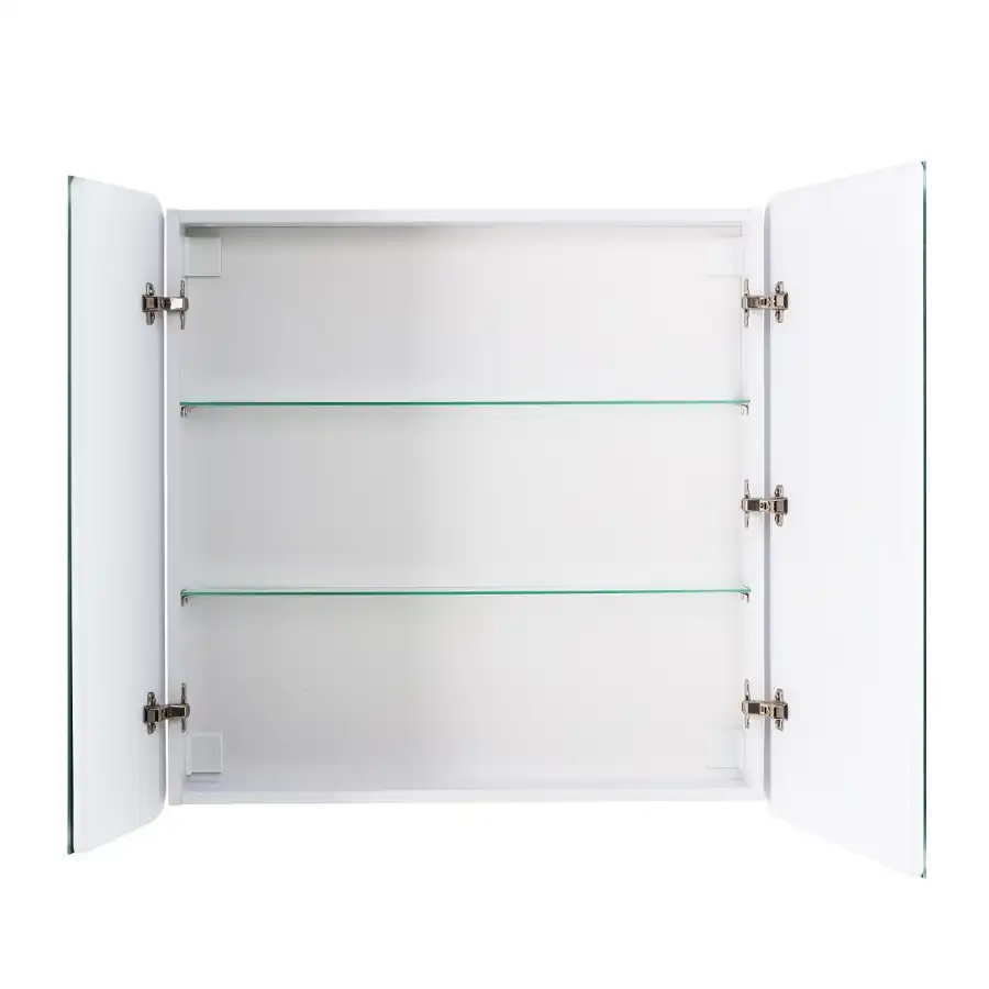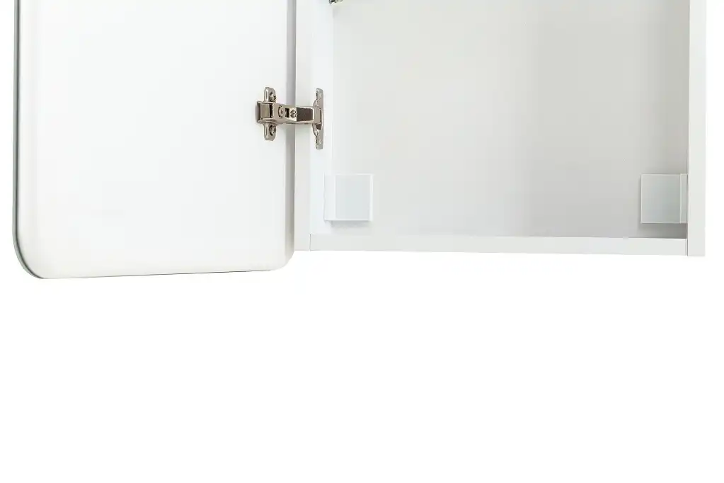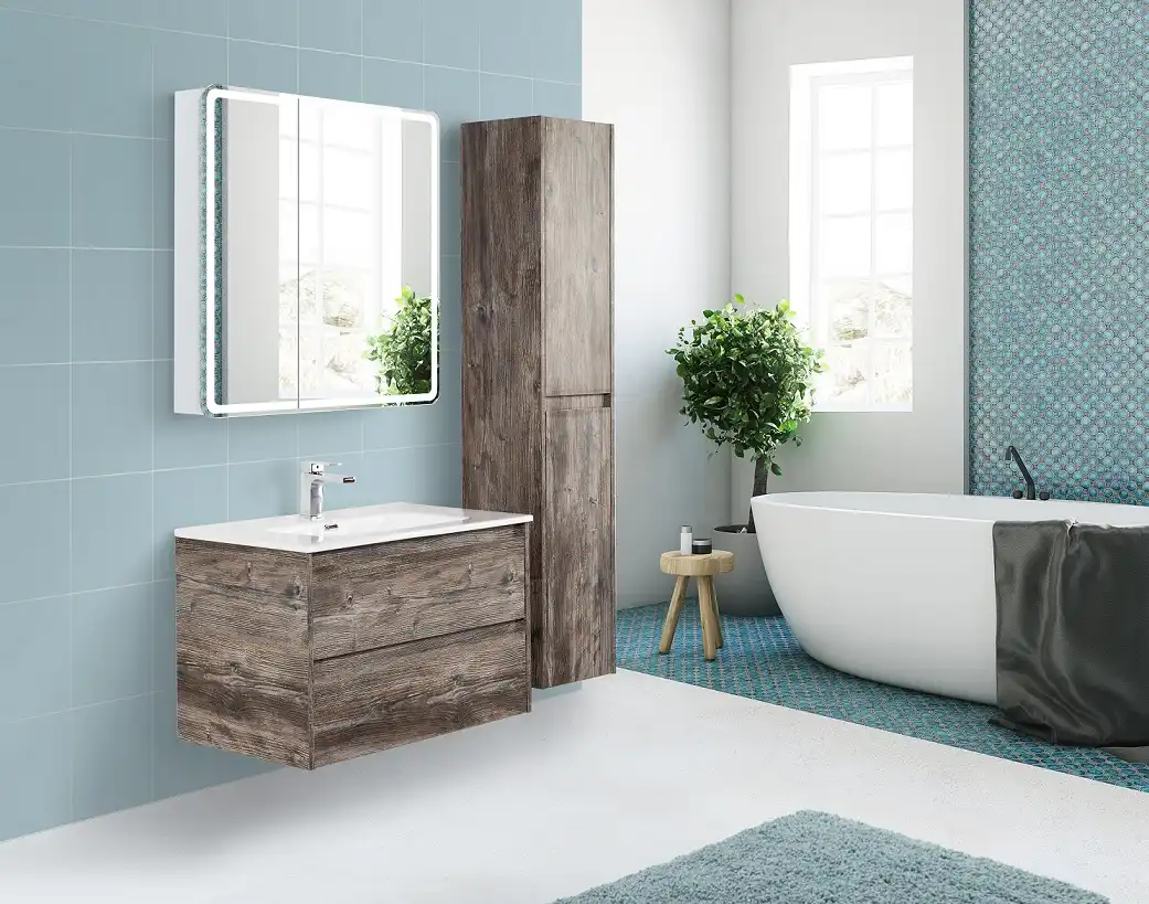Шкаф для ванной комнаты изготовленный из влагостойкого ЛДСП со стеклянными полками внутри, с фасадом из УПС пластика и зеркала с внутренней LED подсветкой.