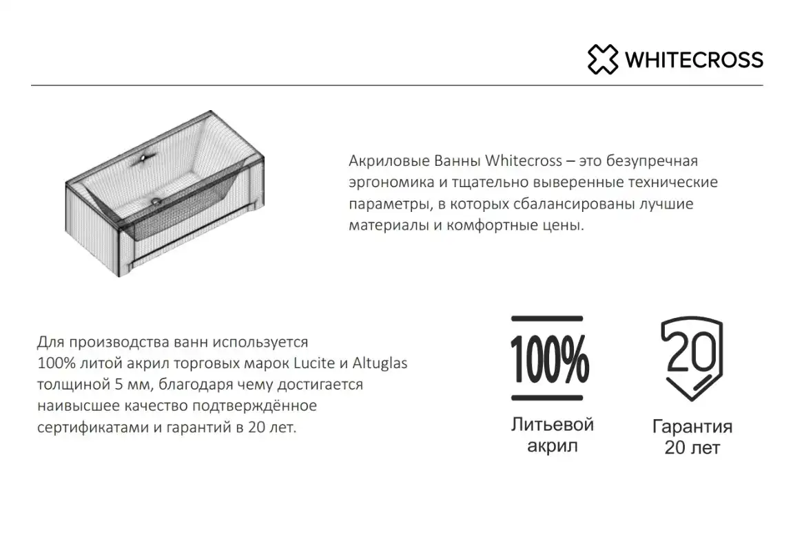 Акриловая ванна Whitecross VIBE, размер 180х75 см, прямоугольная, Белая