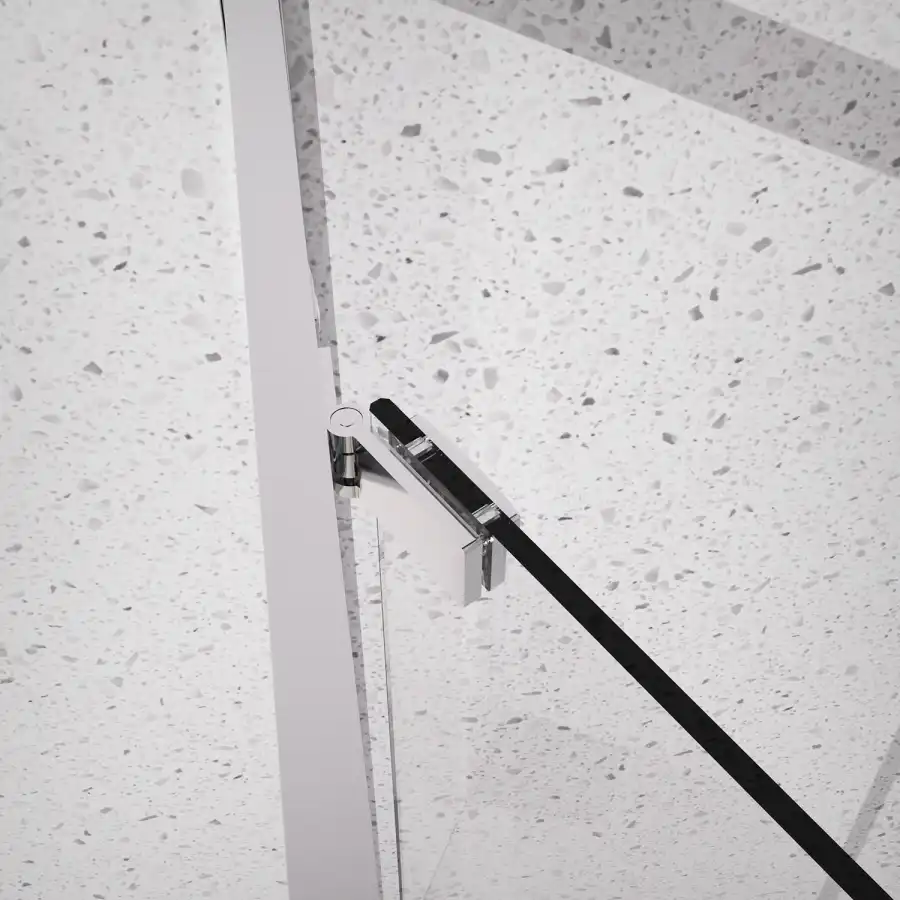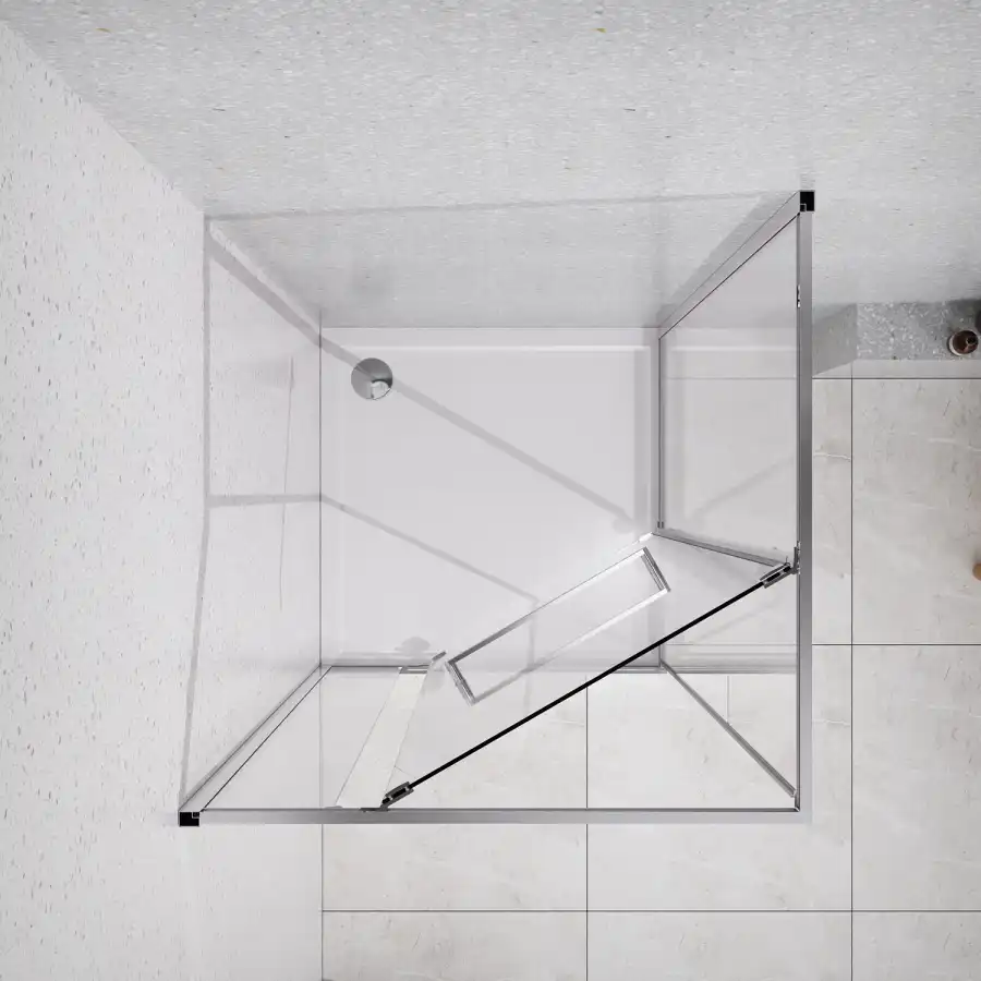 Квадратный душевой уголок, с одной сдвижной дверью, на специальных усиленных и бесшумных роликах на нержавеющих подшипниках. Ручки выполнены из латуни в цвет профиля. Все стекла имеют толщину 6 мм. Профиль выполнен из анодированного алюминия.