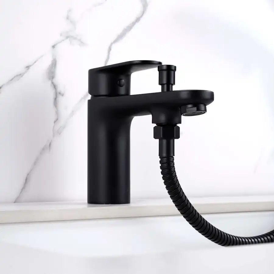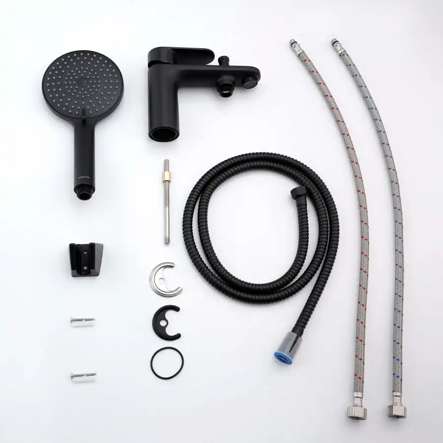 Комплектация1. Смеситель 2. Гибкая подводка 60см 3. Шланг для лейки 150 см 4. Лейка ручного душа 5. Настенный держатель для ручной лейки