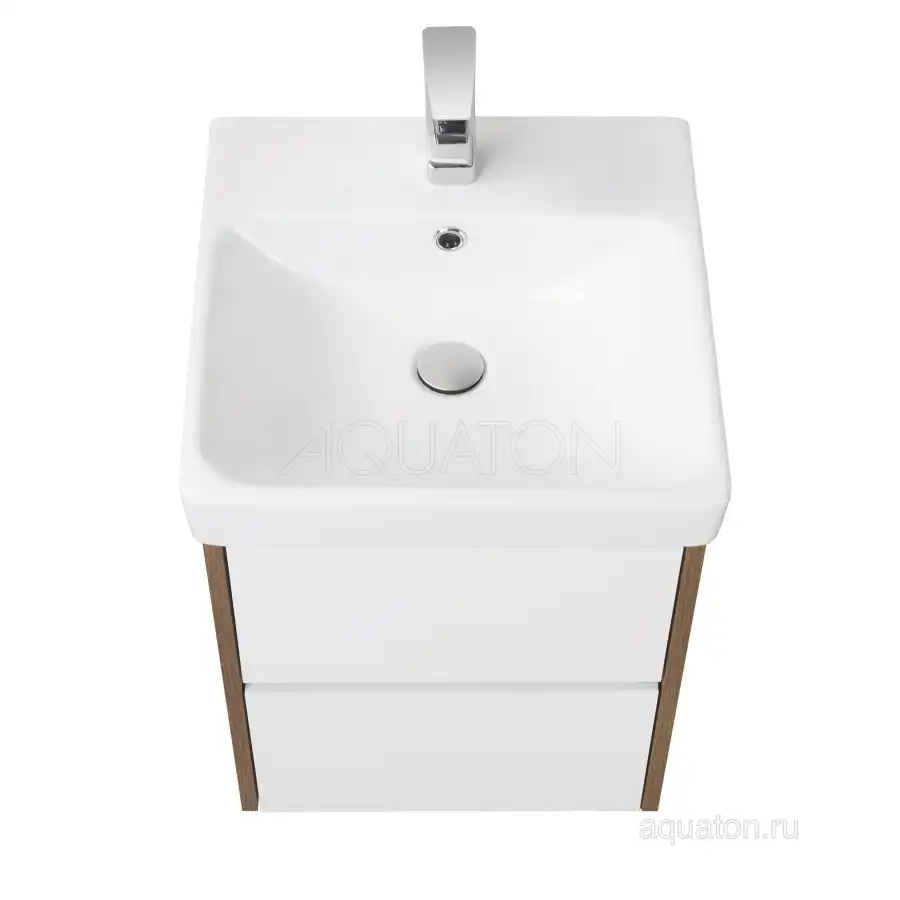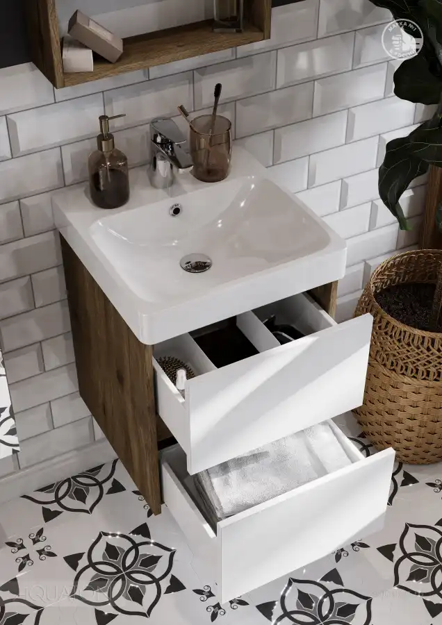 Тумба Сканди 45 выполнена в популярном минималистичном скандинавском стиле. Корпус тумбы выполнен из влагостойкой ЛДСП в декоре натурального дерева, а фасады в белой глянцевой покраске. Конструктивно тумба состоит из 2 вместительных ящиков, установленных на направляющие с интегрированной системой push-to-open для комфортного использования. На тумбе нет выступающих деталей и фурнитуры, открытие ящиков реализовано нажатием на фасад. Тумба комплектуется белоснежной раковиной Адриана от бренда Santek.