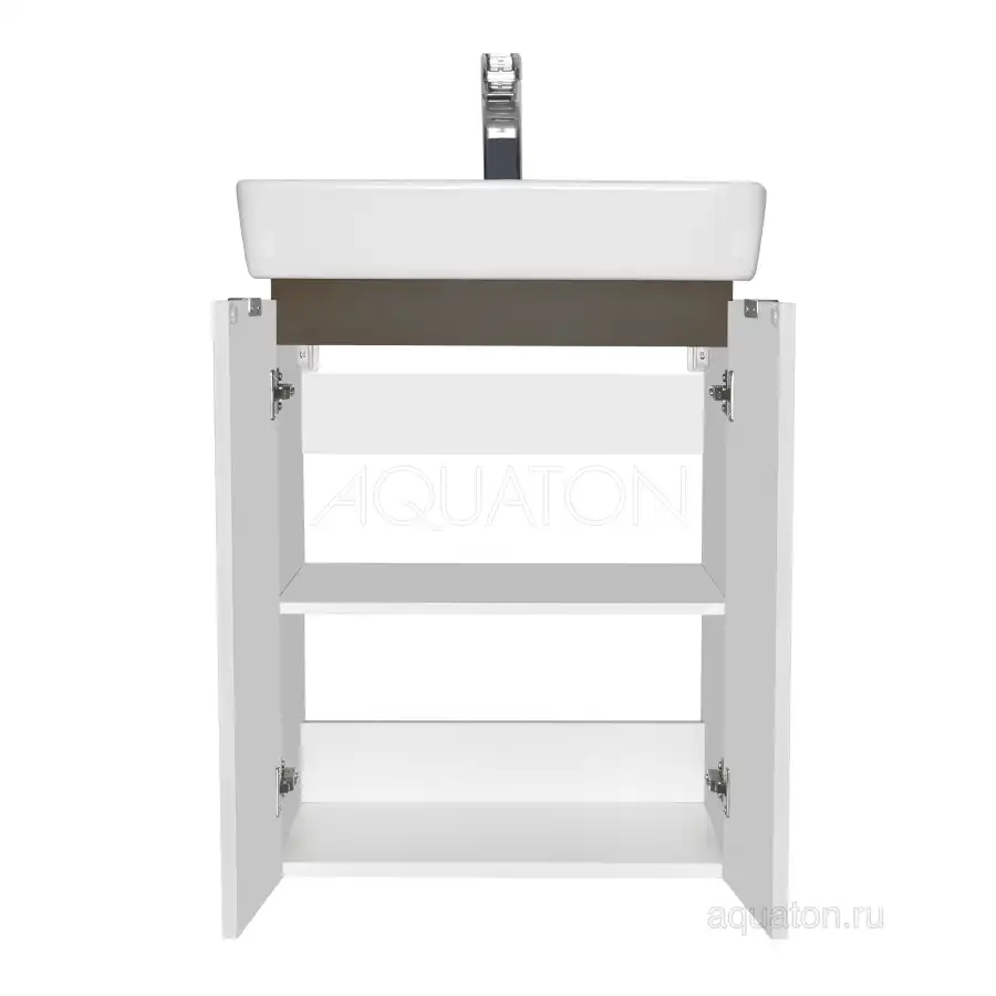 Вместительная и при этом компактная тумба Скай PRO 55 от AQUATON в современном стиле гармонично сочетает ультрабелые глянцевые фасады с декоративной вставкой в цвете серый кашемир - элегантное и практичное решение для удобной организации пространства в небольших ванных комнатах. Корпус модели из влагостойкой ЛДСП и фасады из высококачественной МДФ покрыты белой полиэфирной краской ультрафиолетового отверждения, которая гарантирует безупречный внешний вид, а также прочность и долговечность. За распашными фасадами-створками находится регулируемая по высоте полка, таким образом внутри достаточно места, чтобы разместить всё необходимое. Петли с доводчиком обеспечивают плавное и бесшумное закрывание. Белоснежные глянцевые фасады подчеркивают эргономичные хромированные ручки. Идеальный комплект с тумбой составит раковина Нео от бренда Santek.