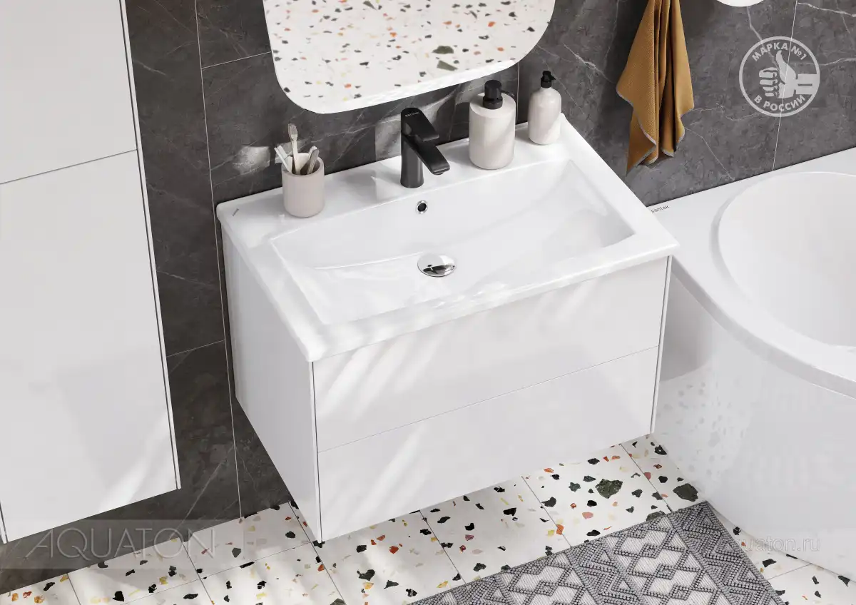 Тумба Сохо 75 функционально состоит из двух вместительных ящиков, оснащенных системой push to open, обеспечивающей надежное, комфортное и бесшумное закрывание. Фасады изделия выполнены из МДФ в белой глянцевой покраске, корпус из ламинированной влагостойкой ДСП в покраске белый глянец. Верхний и нижний ящики оснащены системой организации пространства, которая позволяет содержать косметические средства в идеальном порядке. Дополняет тумбу стильная раковина Элина от бренда Santek с удобной чашей. Все внутренние детали тумбы выполнены в цвете антрацит.